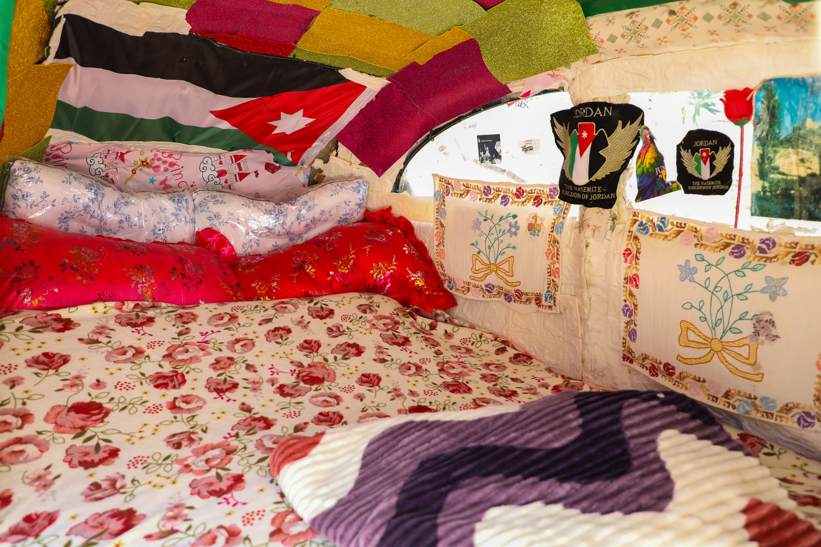 Inside the cozy three-meter car, guests are greeted by a charming collection of pillows adorned with beautiful hand-stitched cases, lovingly crafted by Abu Ali's daughter. The thoughtful decor adds a personal touch to the space, creating a warm and inviting atmosphere.