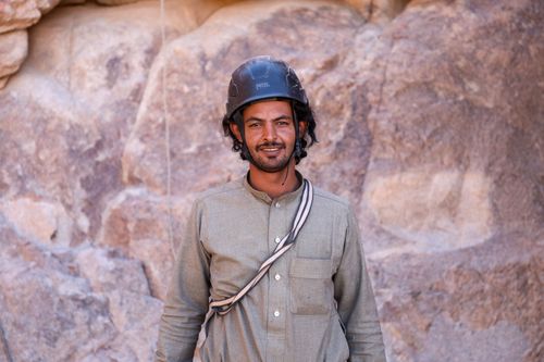 Salameh Zalabyah's journey into rock climbing began with a chance encounter amidst the beauty of Wadi Rum's desert landscape. Nestled within the natural desert setting, Salameh found himself drawn to the towering mountains, each one presenting a new challenge to conquer. It was during one of his explorations that a tourist noticed him effortlessly navigating the rocky terrain, his passion for the mountains evident in every step. In 2014, he set on a transformative journey, exploring and divingin the intricacies of rope climbing and mastering the necessary equipment. By 2019, Salameh had reached his skills to perfection and transitioned into a professional climber in Wadi Rum. His dedication caught the attention of the Tourism Authority, which facilitated additional training. Fueled by his passion and equipped with certificates and licenses, Salameh now extends his expertise to aspiring climbers, welcoming them to experience the thrill of scaling Wadi Rum's majestic peaks.